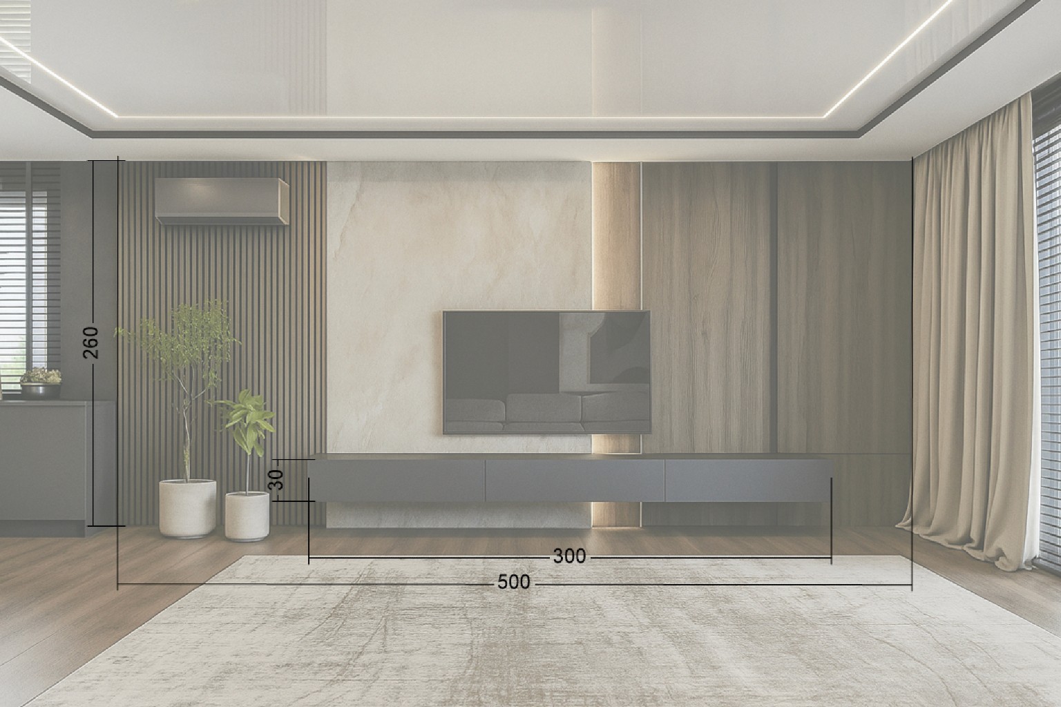 Centralne tło o delikatnym, mineralnym rysunku wprowadza do wnętrza lekkość i równowagę, stanowiąc eleganckie tło dla strefy telewizyjnej. Po bokach pojawiają się pionowe podziały, rytmiczne lamele oraz pełne, drewniane powierzchnie, które budują głębię i nadają aranżacji charakter.